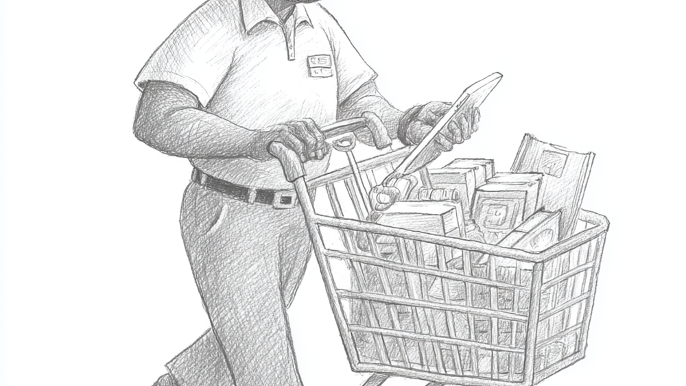 A man pushes a shopping cart full of products while looking at a list on his tablet